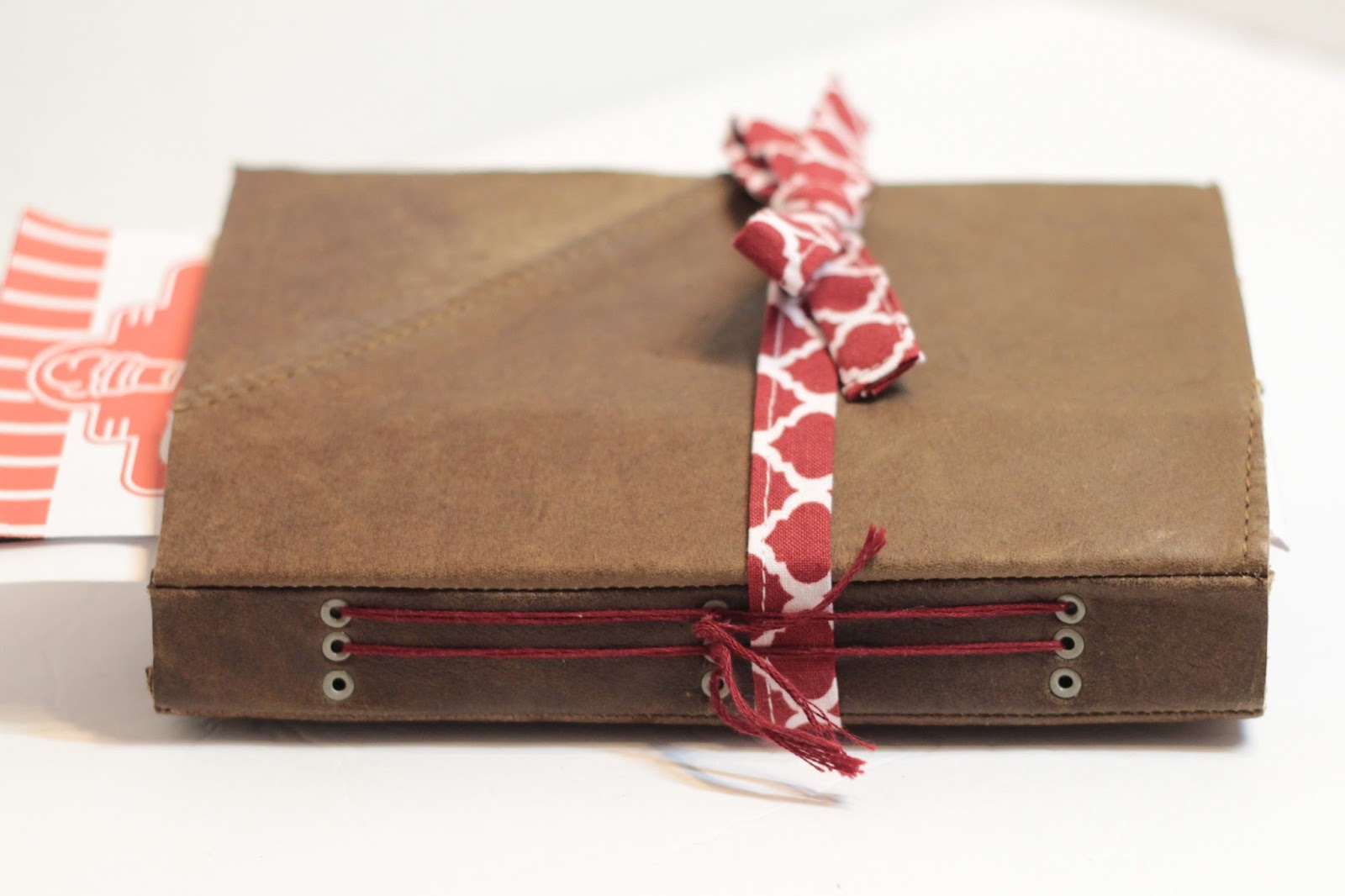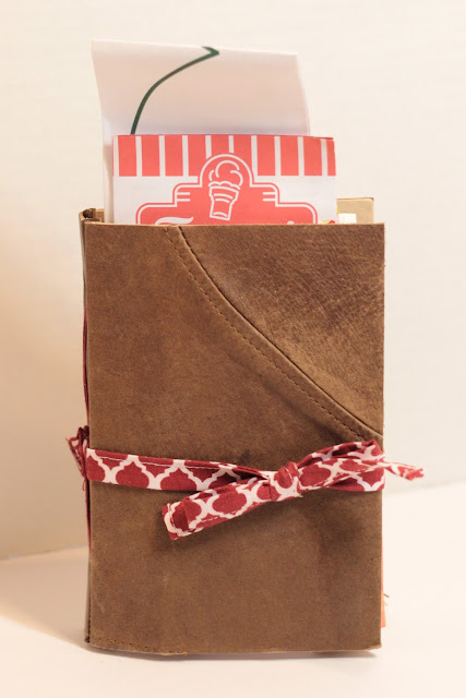 I made this book from a cereal box, an old leather jacket and random scrapbook papers. I filled it with photos and ephemera from a couple trips I took last year. I had three different sections in it, but that made the book too big, so I removed one of the signatures. (I'm even learning new things!) It works a lot better, but now I have three empty holes down the side of my album.